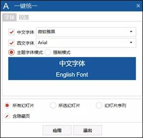 安装该插件后,利用“一键统一”功能,即可统一所有幻灯片字体或统一任意选中的幻灯片字体。