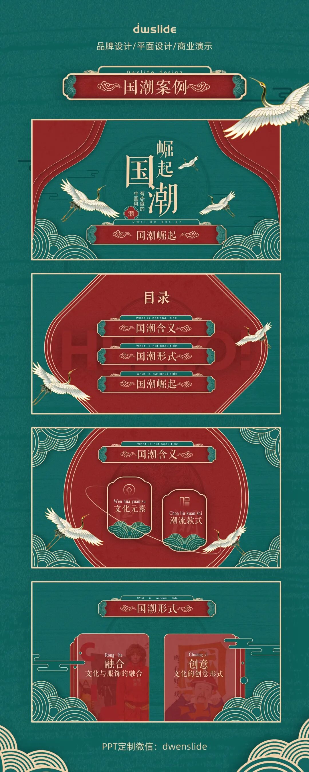 做好准备工作后,我们就可以开启今天的改稿工作了,下面便是我用PPT设计的国潮风模板啦。除了那只鹤的颜色不可修改其余元素都是可以修改编辑的。