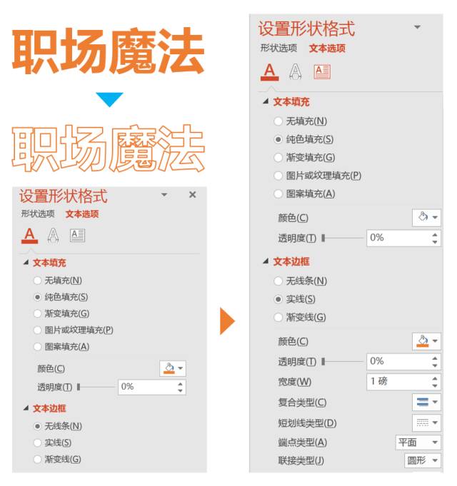 打开设置形状格式,将原来的【纯色填充】变成【渐变填充】,我们可以看到纯蓝色的职场魔法就变成了渐变的职场魔法,切换到渐变以后,我们可以通过【渐变类型】、【光圈】和【方向】的调节改变参数得到自己想要的效果,如下图所示: