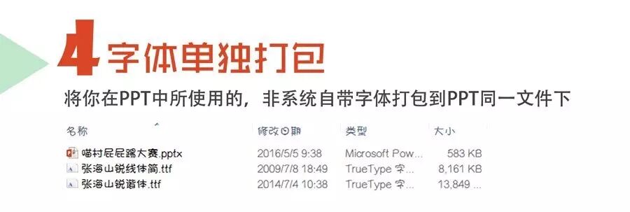 ▲直接将你使用的特殊字体的安装包打包和你的PPT文件放到一个文件夹里面,这个方法最简单、实用、粗暴!