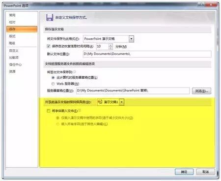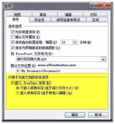 PPT2007-2013:打开一个PPT,单击【文件】,在下拉菜单选择【PowerPoint选项】命令,在弹出的对话框中切换到【保存】标签,勾选【嵌入Ture Type字体】选项