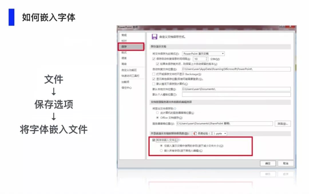 Windows用户在保存时需要在【文件】中的【保存】选项中选择【将字体嵌入文件】的选项。这样就万无一失啦。