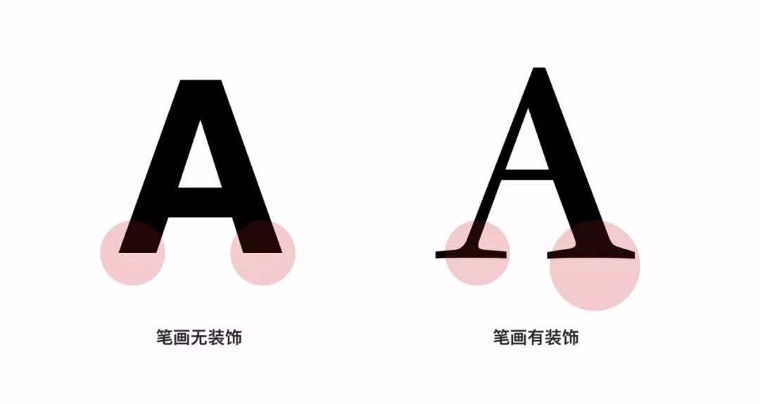在设计过程中,无论装饰与否都不会影响我们能基本识别这两类字体,为了区分,通常把右边这类有装饰的字体叫作【衬线字体】,而左边没有装饰的就是【非衬线字体】。