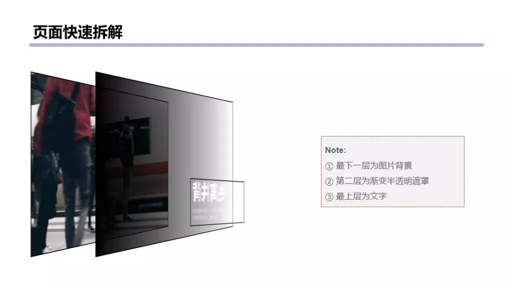 那么这种是如何制作的呢?其实很简单,先来分析下整个页面的结构,这页PPT总共有3层,分别是「背景」「遮罩」「文字」,这里的「遮罩」是为了让「文字」更加清晰,因为背景偏白,如下,我们做了一个简单的拆分: