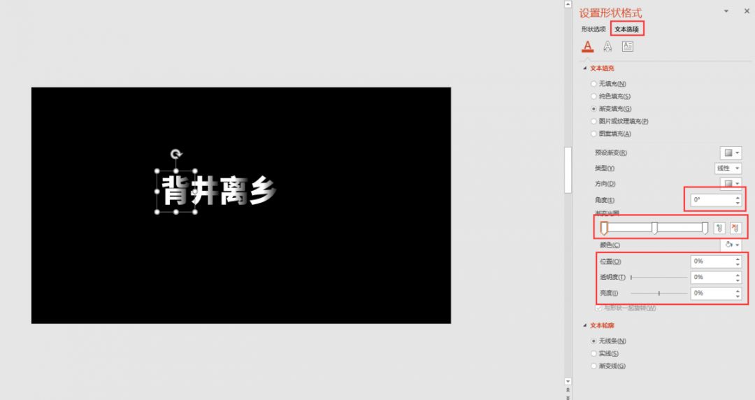 接着我们「右击」字体,打开「形状格式设置」,选择「文本选项」,修改为「渐变填充」,添加「3个光标」,设置填充色为「白色」,透明度分别为「0%、0%、100%」,最后将「角度」调成0。具体参数如下所示:
