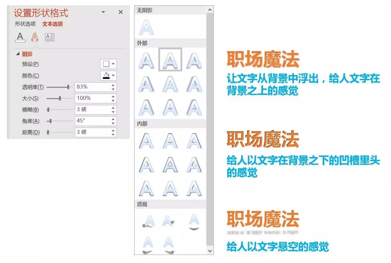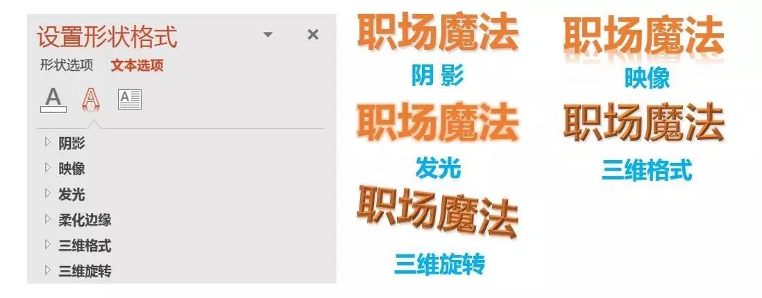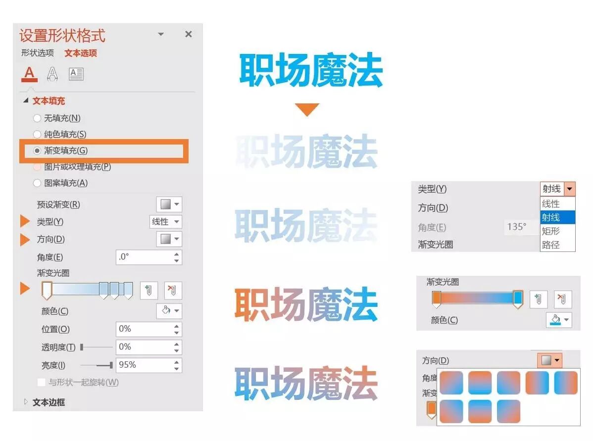 打开设置形状格式,将原来的【纯色填充】变成【渐变填充】,我们可以看到纯蓝色的职场魔法就变成了渐变的职场魔法,切换到渐变以后,我们可以通过【渐变类型】、【光圈】和【方向】的调节改变参数得到自己想要的效果,如下图所示: