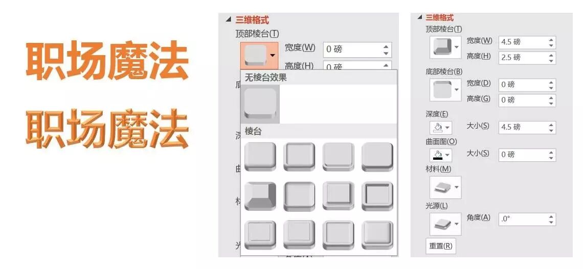 这两种字体美化效果纯属是用来装逼,让文字有种立体质感,点开三维格式,选择适合你PPT字体的棱台效果后调节参数即可。