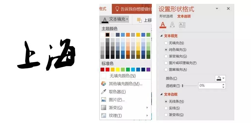 直接点开文字格式工具栏中的文本填充,在主题色或者标准色其他填充颜色中直接选取颜色点击即可。而在设置形状格式中则是点开文本填充框,在纯色填充中换颜色即可。