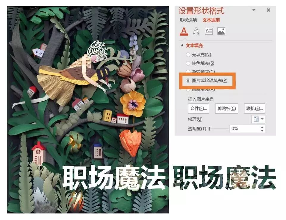 右边的职场魔法就是用左边的图做图片纹理填充而来的,在将填充变为【图片或纹理】填充后点击【插入图片来自】,选择【文件】,在电脑中找到准备好填充的图片点击插入即可。