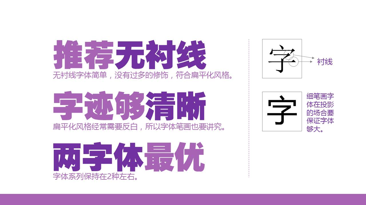 三个原则:推荐无衬线、字迹够清晰、两字体最优。