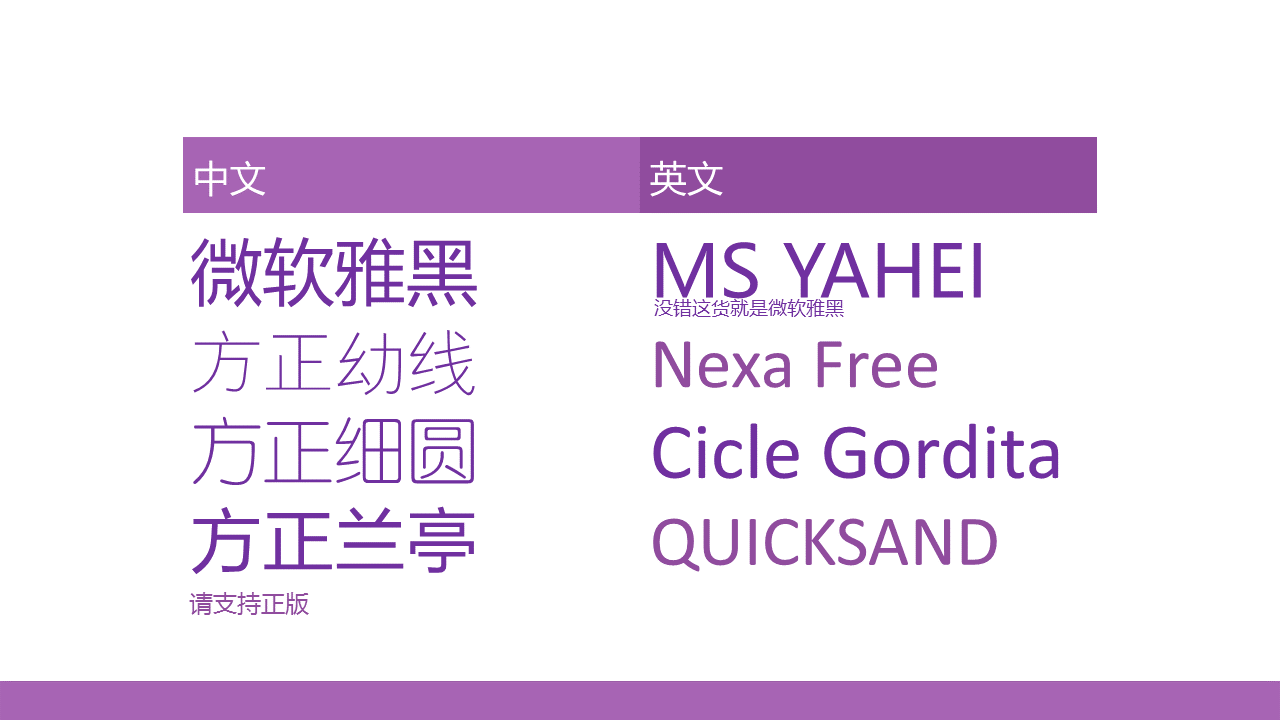 微软雅黑、方正幼线、方正细圆、方正兰亭等。