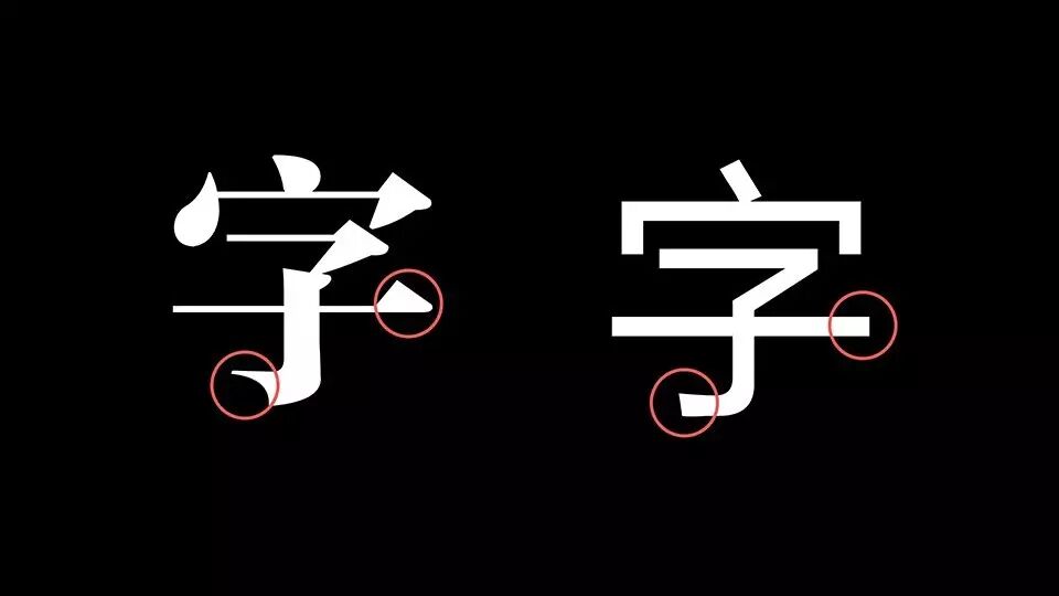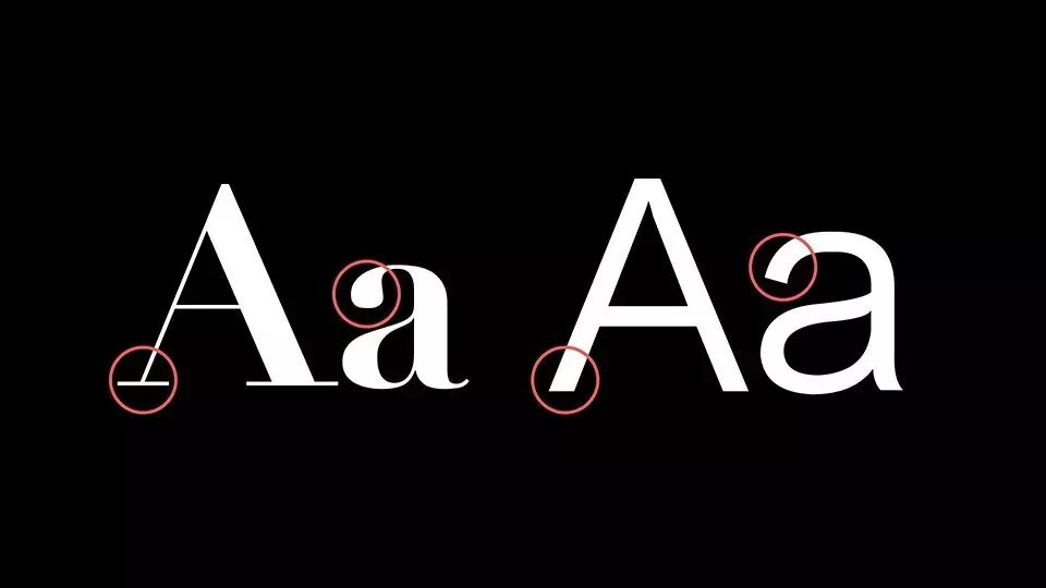 我们观察上面两幅图,注意左右两个字体被红色圈出来的部分。左边的字体,有粗细的变化,而且在笔画开始、结束或转角处有明显的修饰,这种字体是衬线字体。右边的字体粗细一致,没有多余的修饰,是无衬线字体。