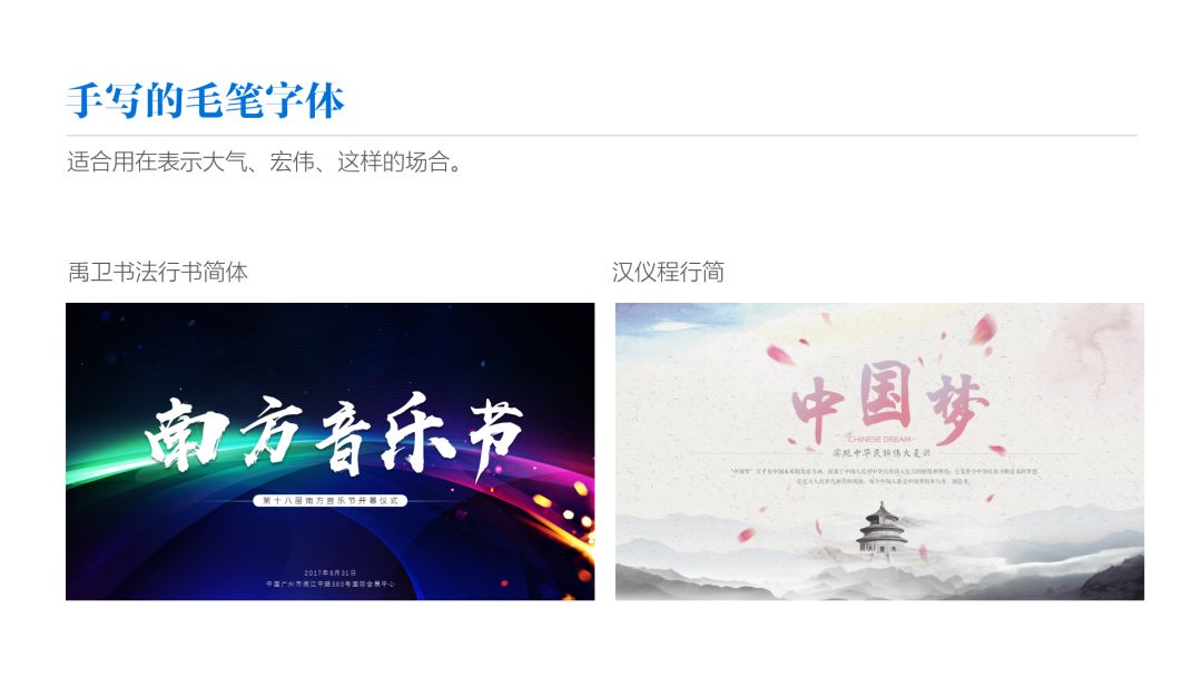 第四种是手写的毛笔字体,这种字体由于笔划较为宏伟大气,所以适合用在表示大气、宏伟、这样的场合。