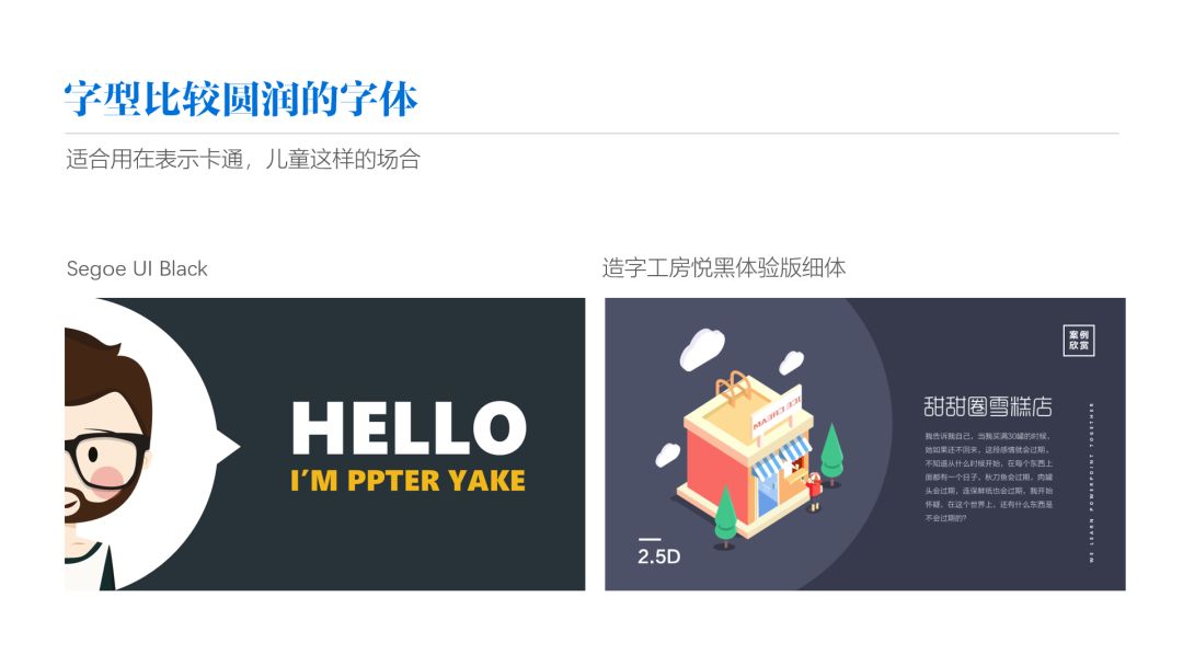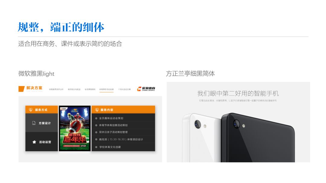 比如你现在看到上面的两张幻灯片,使用的都是方正兰亭细黑简体以及微软雅黑light作为正文的字体,这样的字体由于笔划较为纤细,所以画面看起来是比较简约的,而且字体在电脑上也容易识别。