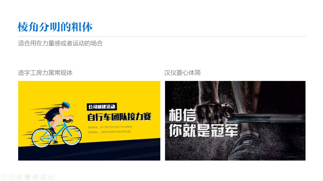第一种是棱角分明的粗体,就像咱们刚刚谈到的造字工房力黑常规体,这种字体比较有力量感的,就可以使用表示有力量感或者运动这样的场合。