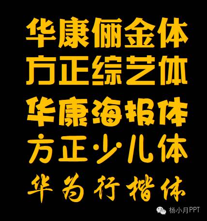 华康俪金体、方正综艺体等用于标题也是非常不错的,华康海报体和方正少儿体可以用在比较活泼幼稚类PPT中,华为行楷体等可以用在历史文化介绍类PPT中。