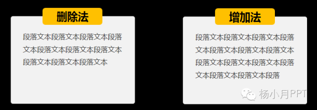 增删法怎么做呢?比如左对齐的段落文本,如果最后一行的文字很少,则可以从语义上将段落文本中不重要的几个字删掉,从而减少一行实现对齐(如下图左);如果文本最后一行的文字比较少,但又不够超过一行的0.618(黄金分割线),则可以考虑从语义上增加几个字,补足最后一行的文字(如下图右)。对于两端对齐和居中对齐的段落文本,同样可以采取上面的两种方法实现更加高大上的对齐。