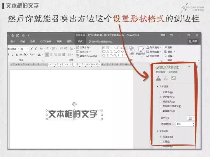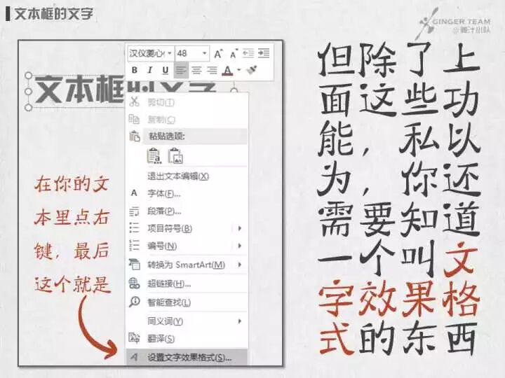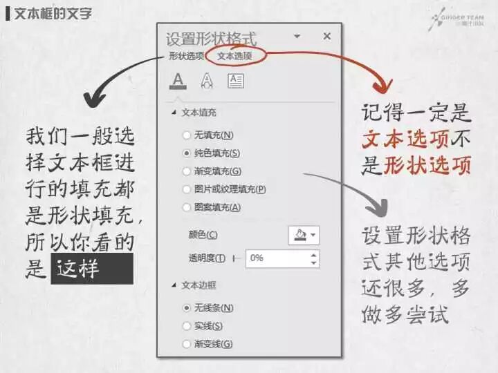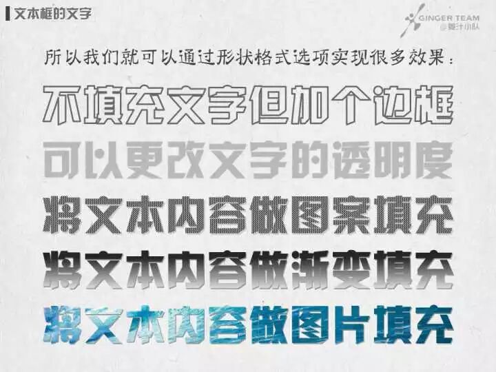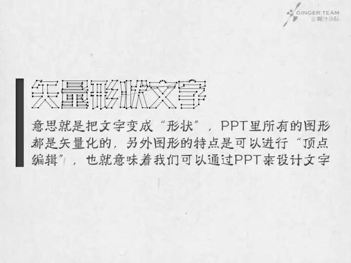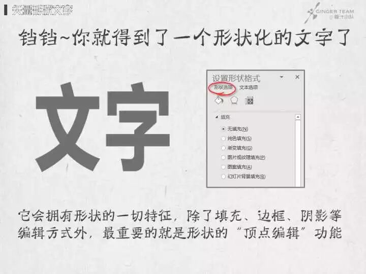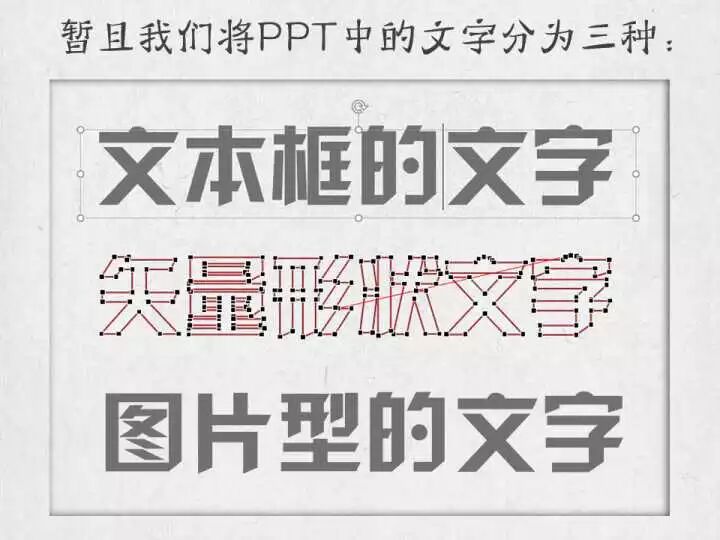 其实文本框文字和矢量图形文字在填充、边框等方面的编辑上,基本都一样,但是如果涉及到高级点的变化,比如动画变体、控点什么的(下面会讲到)的时候,就完全不一样了。而且,如果我们做的PPT是给领导的,一定注意把文字,特别是你做了特殊字体的,矢量化一下(保存字体的选项不靠谱啊,非常有可能到时候无法识别啊)
