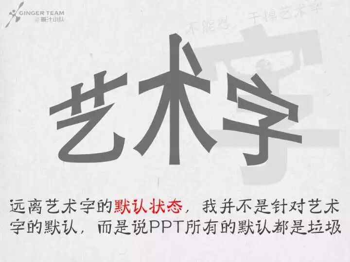 首先,还是很多教程都有说过的,远离宋体,远离艺术字。但只是远离而不是抛弃,宋体在很多时候其实还是蛮实用的,特别是办公类PPT,比如每页字不多不少的时候,或者一些小文艺小清新作为配图的时候。