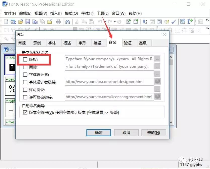 第三:如果你的字体无法嵌入,说明带有版权限制,不允许嵌入。这里推荐一个小软件FontCreator,可以删除字体版权限制。用软件打开字体,如图所示把【版权】去掉,保存字体,覆盖安装即可。文末提供软件下载。