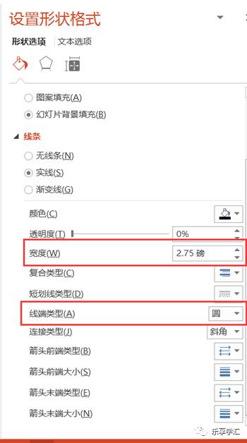 4、设置线条格式,将填充色设置为无。线条设置宽度设置为2.75磅。线端类型设置为圆。