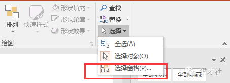 大家都知道,当某一页PPT元素过多时,我们编辑起来就会很麻烦,有了图层的概念,我们就可以分层编辑,暂时不需要的图层可以选择隐藏起来。点击【选择窗格】就能看到这个功能。