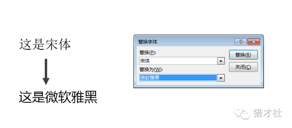 当我们做了一个PPT,里面正文用的是宋体,但是做好之后,我们觉得,正文用微软雅黑会更加好一些。我们点击【替换字体】,即可一键替换文件中所有的宋体,变成微软雅黑。试想一下,如果没有这个功能,我们要花费多大的力气才能全部替换?