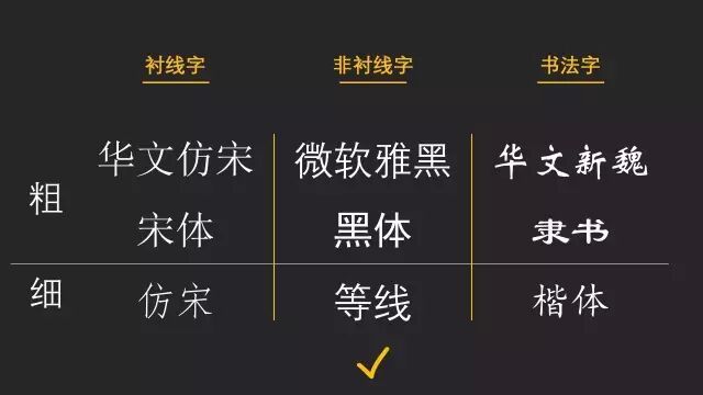 衬线字:即字体在笔画间有明显的粗细变化,例如宋体的一撇,从粗到细很明显;