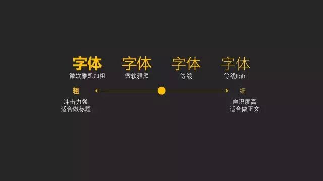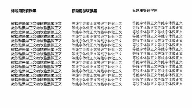 传统的PPT制作中一般都会采用标题用微软雅黑(加粗),正文用微软雅黑的组合,所以微软雅黑也叫PPT字体万金油。大帅一开始也是靠着微软雅黑一招鲜打天下,但是PPT做多了发现一个问题:微软雅黑这个字体做标题ok,做正文有点偏粗,文字多,文字颜色选黑色后,感觉页面上黑压压一片,美观度大打折扣。大家可以根据上图感受下不同字体做正文的区别,等线这个相对偏细的字体比微软雅黑做正文字体要好的多。(等线字体是office2016自带的,如果你还在用2016之前的版本,正文可以使用华文细黑)