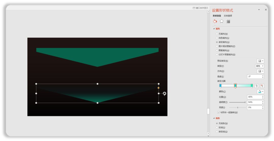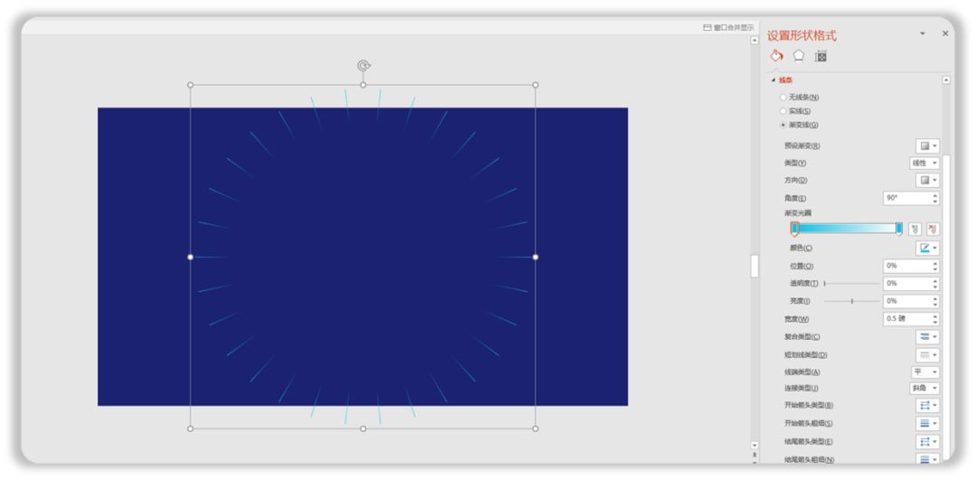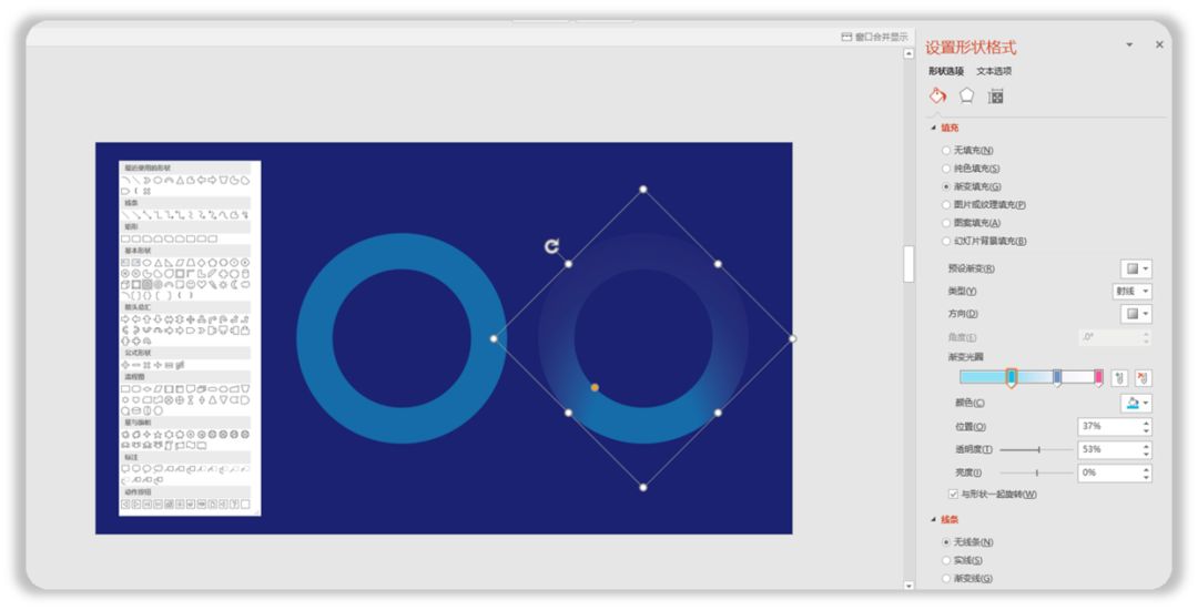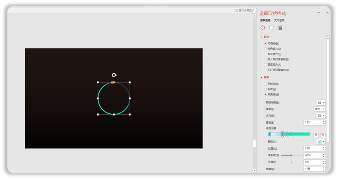 这里面的元素制作也比较简单,插入形状之后,调整渐变光圈的透明度(这里有极限值),如图所示。