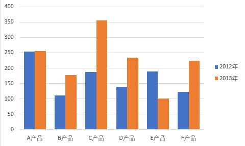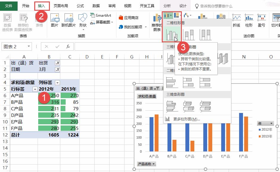 Step 01 单击2012年这一列数据的任意单元格,再插入柱形图。