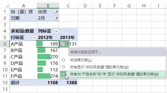Step 02 将格式规则应用于所有为“产品名称”和“年”显示“求和项:数量”的单元格。