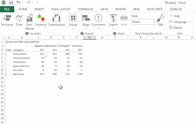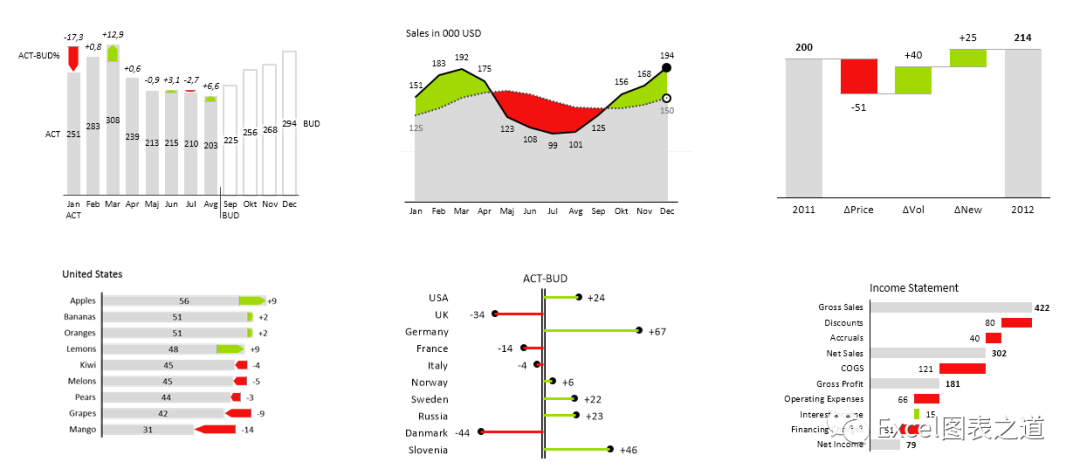 ZebraBI是Excel可视化插件,提供多种Excel所不具备的图表类型。这些图表类型特别适合财务人员,尤其是瀑布图可视化损益表,其嵌入表格的功能,让图表可以与表格融为一体。