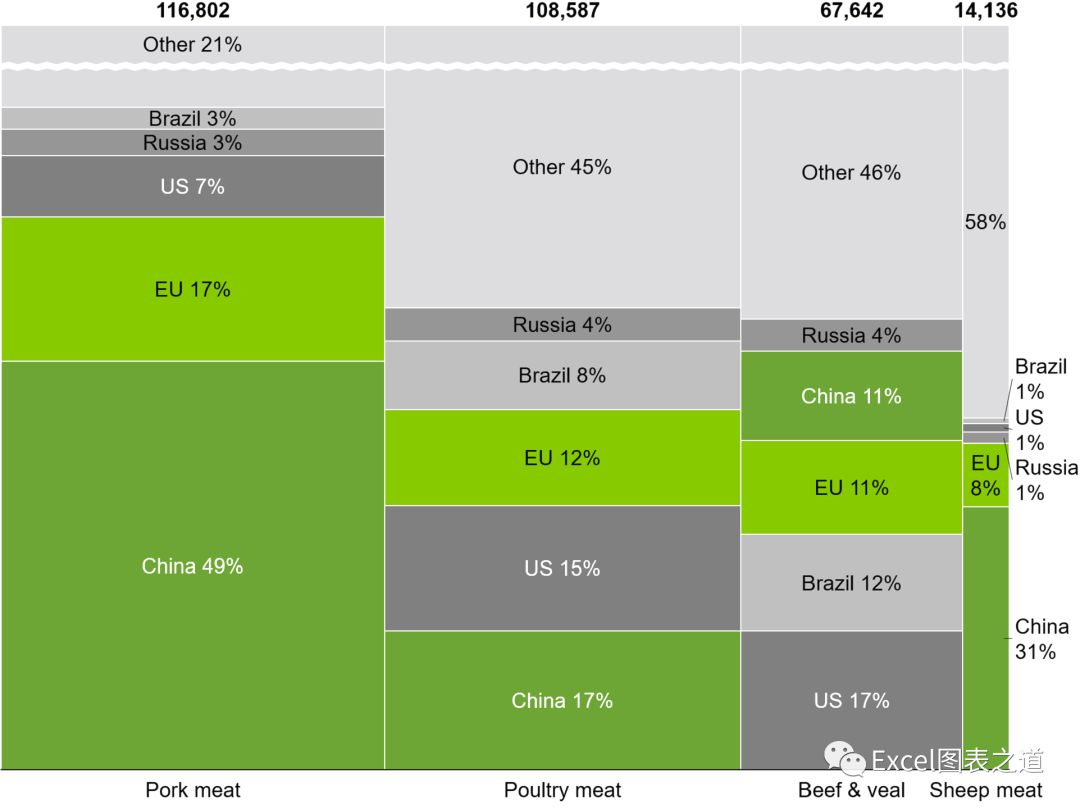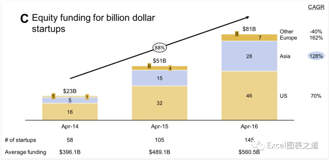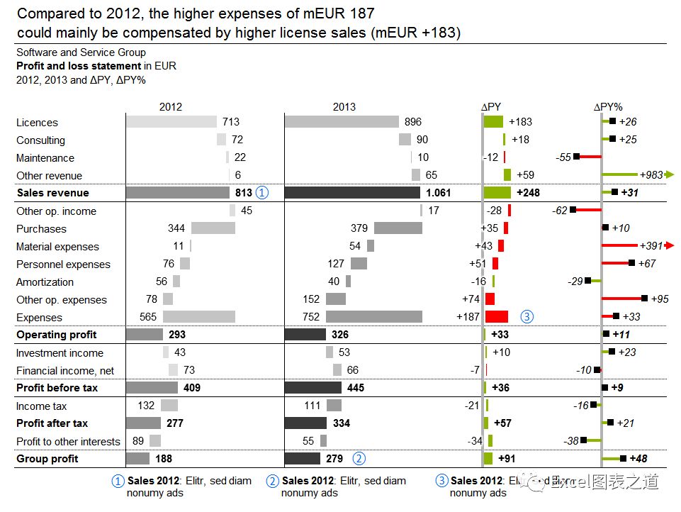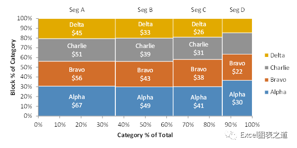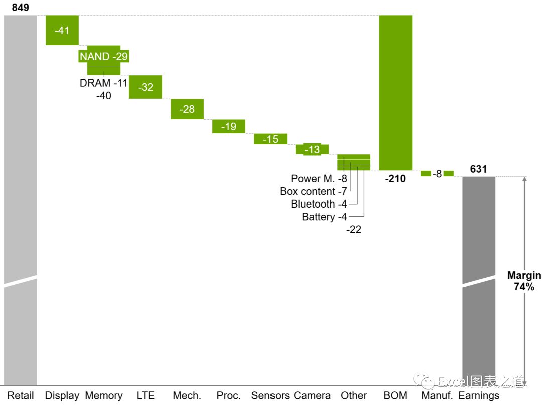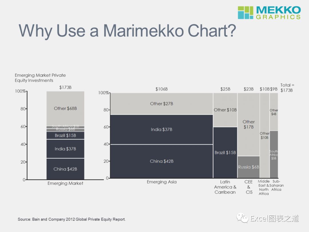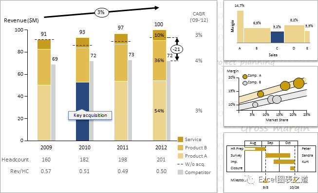与上面一个类似,也是以Mekko图为特色。我们可以注意到,cagr箭头、瀑布图、Mekko图、甘特图,是咨询报告最重要的图表类型,且都是Excel内置所不支持的,从而导致了这些插件的诞生。