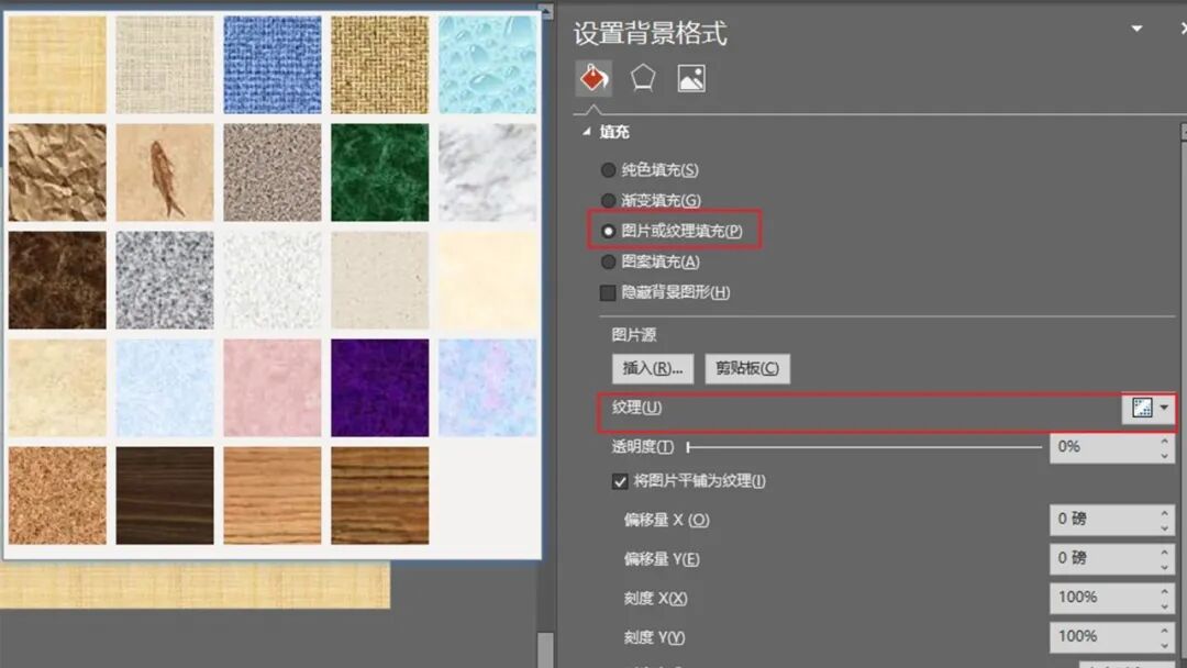 像这种比较有质感的背景,可以使页面不那么的单调,除了在网上下载,其实在PPT中也给我们提供了一些纹理。