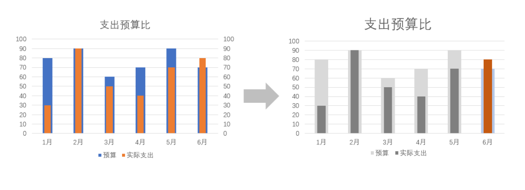 选中图表,点击【图表设计】——【更改图表类型】,在弹出的【更改图表类型】对话框中选择【组合图】,把实际支出对应的【折线图】改为簇状柱形图,并勾选次坐标轴。