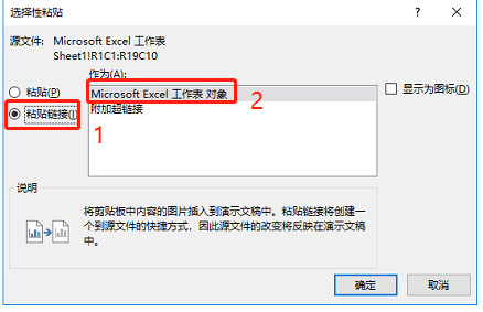 3.【粘贴链接】—【Excel工作表对象】—【确定】,最后在PPT内拖动调整一下表格大小和位置即可,如下图: