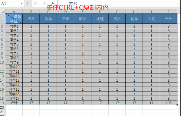 1.打开Excel表格按住Ctrl+C复制内容如下图: