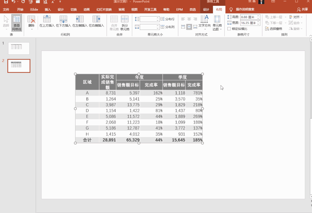 别手动拉拽!尤其是有合并单元格的时候。PPT里的行列拉拽操作,表格整体高宽度都是不受影响的,你拉宽了第一列,第二列就变窄了。正确的操作是,利用表格工具——布局。还可以一键平均分布行列。如图: