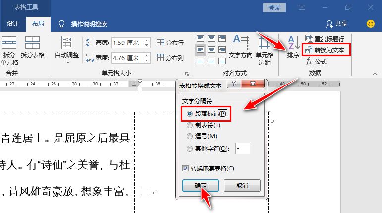 二、然后将光标定在表格内,在表格布局里点击“转换为文本”,选择“段落标记”