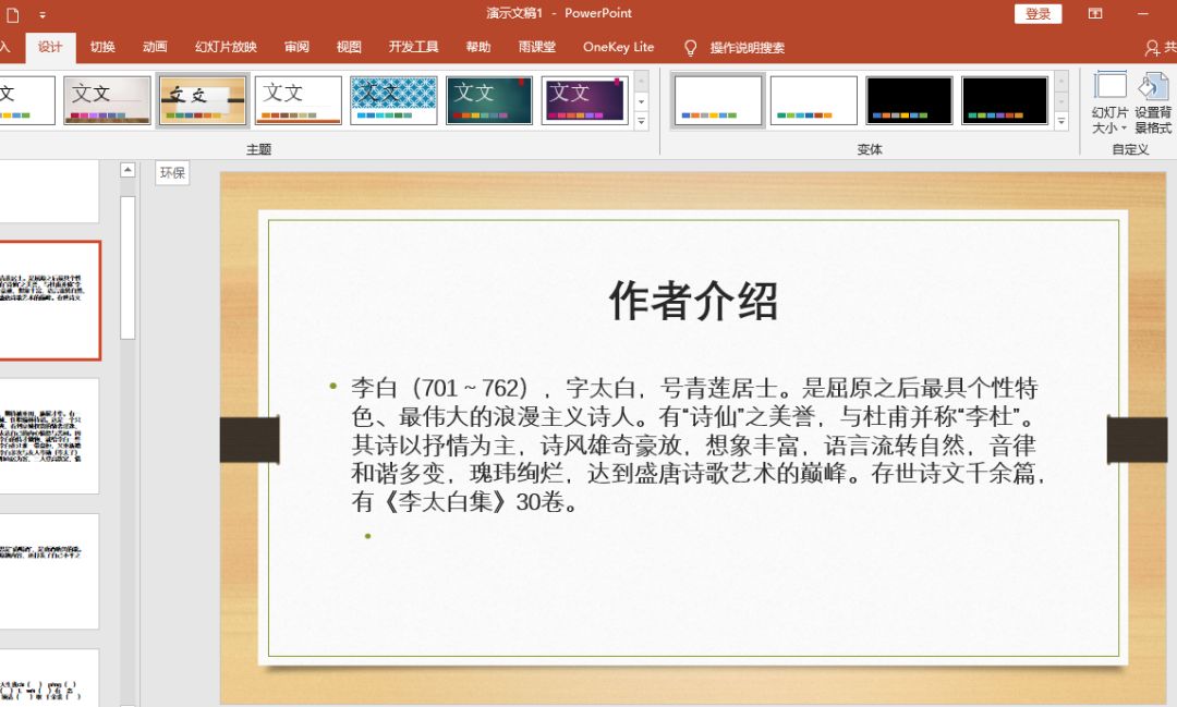 在PPT的【设计】选项卡中,选择一个模板,你的PPT就快速实现美化了。