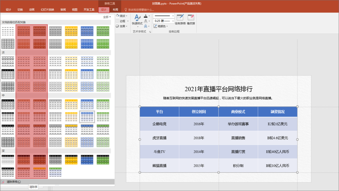 最简单的美化,选中表格-设计-系统会根据你设定的配色自动生成一些表格让你挑选。