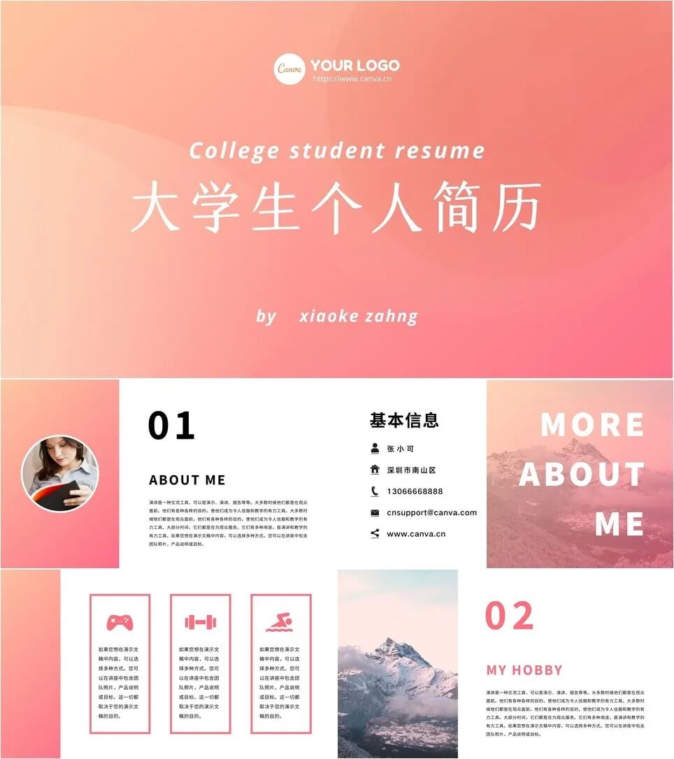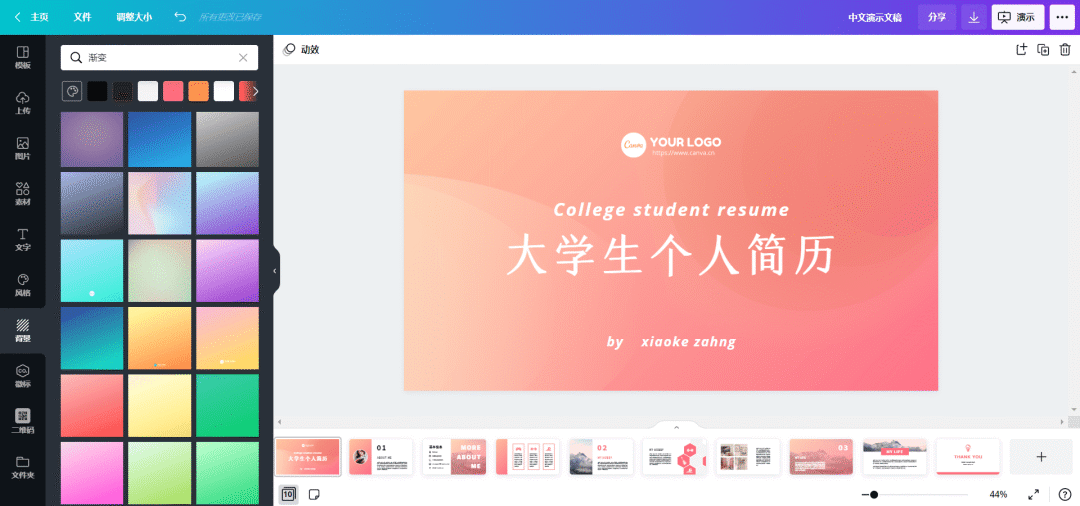 此外,你还可以直接使用Canva可画提供的渐变色PPT模板。打开浏览器登录www.canva.cn,即可在线修改PPT设计模板,替换你自己的文字稿,修改图片或者色彩等。