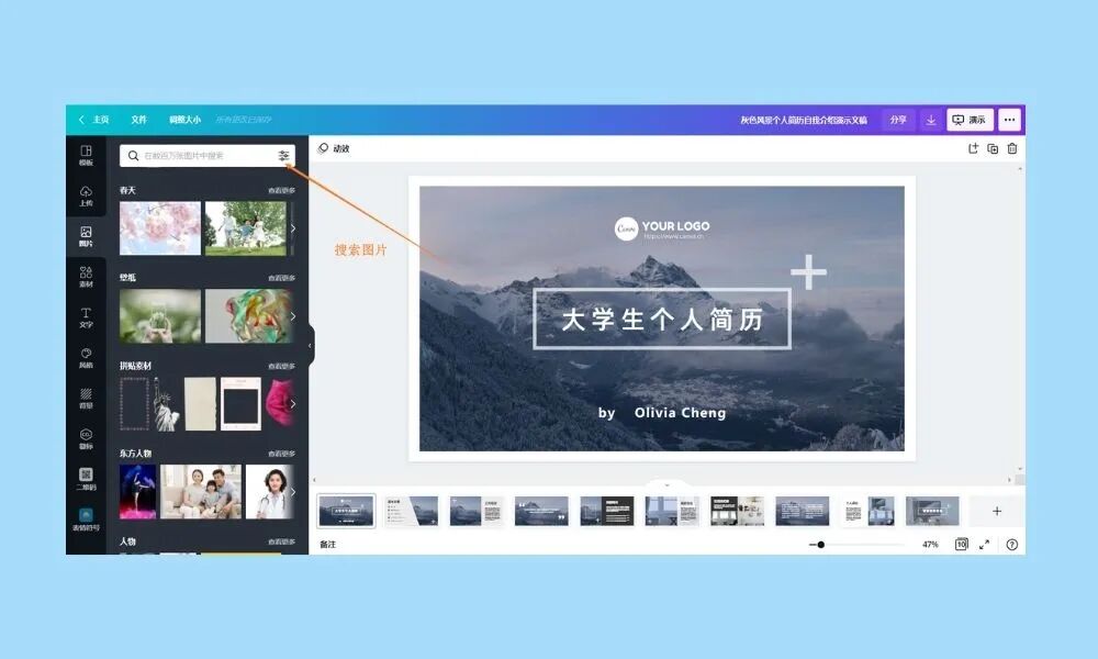 打开Canva在线编辑器,点击左侧工具栏的【图片】,输入关键词,即可浏览并使用海量图片素材。