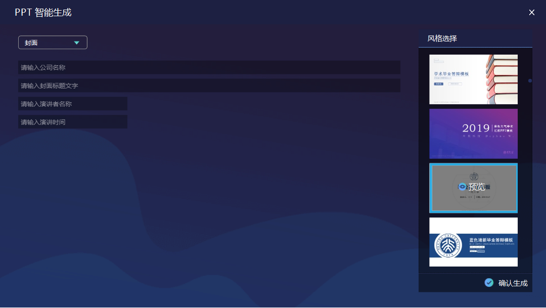 在Piti的PPT智能生成中,提供了不少模版。据开发者说,他们与国内的顶级PPT设计师合作,建立了一套完善的PPT模版库。使用起来也相当方便:选中合适的模版后,直接在左侧输入框中输入相应的文字即可。