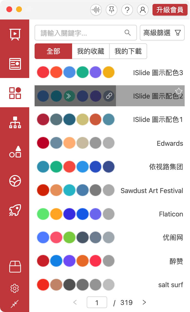 除了常用的幻灯片模版之外,我们还可以找到推荐的配色库: