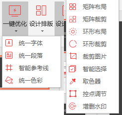 除了Mac版中丰富的各种模版、资料库之外,Windows系统上的iSlide还提供了一键优化、设计排版等功能。