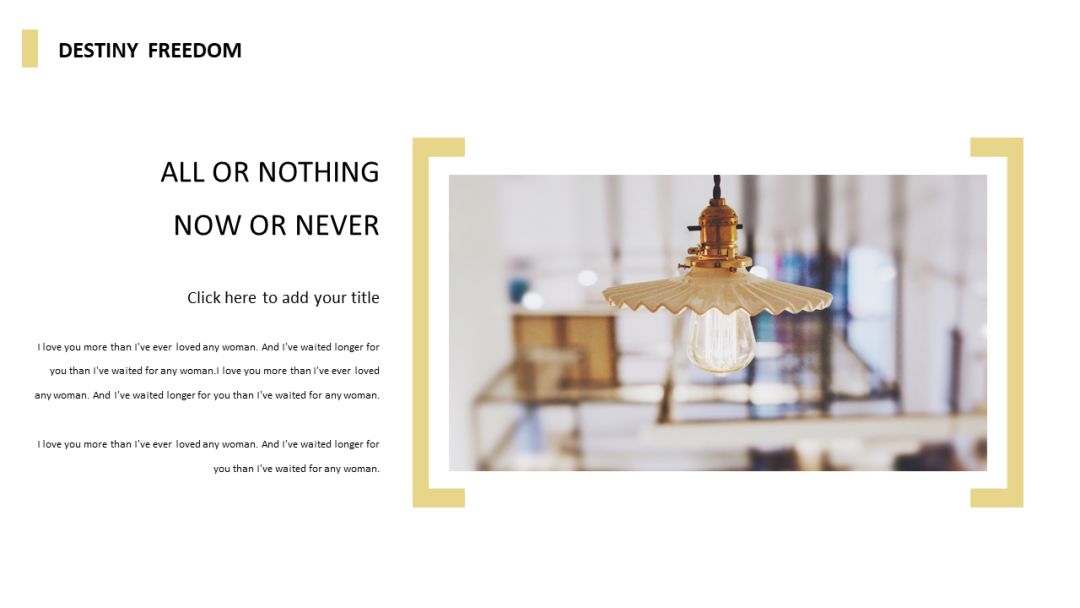 如果仔细分析,你就会发现,刚刚我们费了半天劲加各式各样的色块,主要是为了修饰文字,让文字部分有一个「藏身之地」。其实除了修饰文字之外,色块也可以用来修饰图片(上面五个PPT的前面两个)!另外,对于图片我们除了可以用色块来修饰之外,也可以用粗细不同的线条来点缀(比如最后三个PPT)。