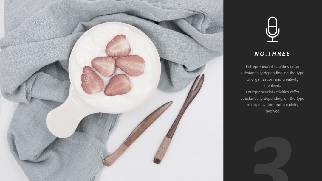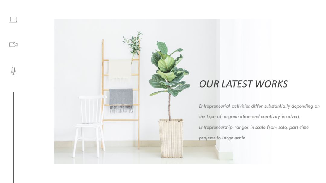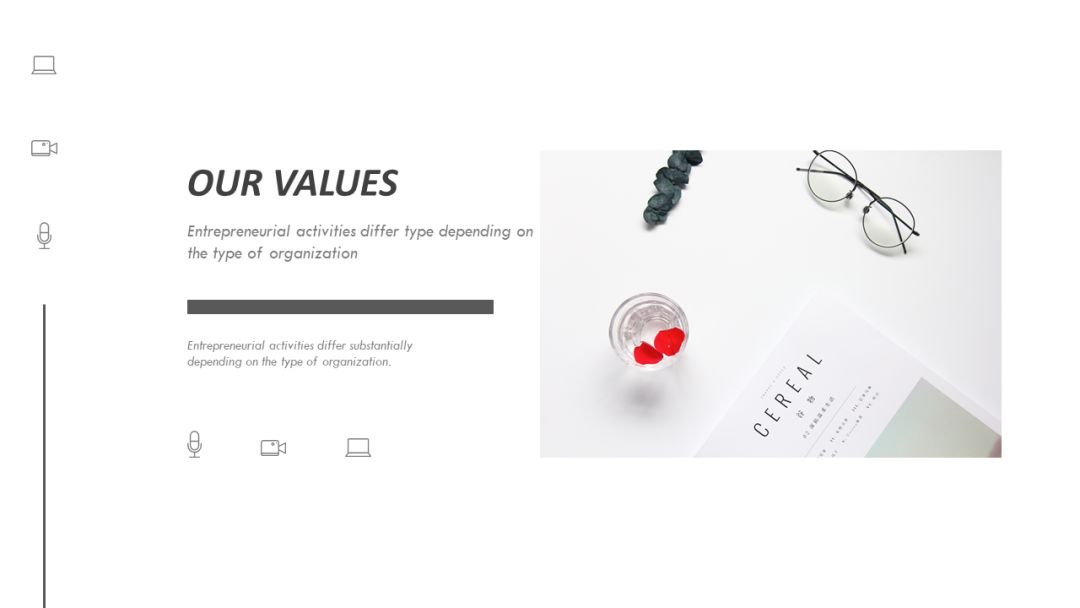 以上三个作品,其实要论排版,就是最典型的「一侧图片,一侧文字」PPT,但是整体看起来却不单调,甚至有点小清风的日式风格。原因在哪里?除了图片的关系之外,最关键的一点就是位于左边的修饰物——三个图标和一个线条!其实就这么一点缀,整个版面瞬间有了感觉。