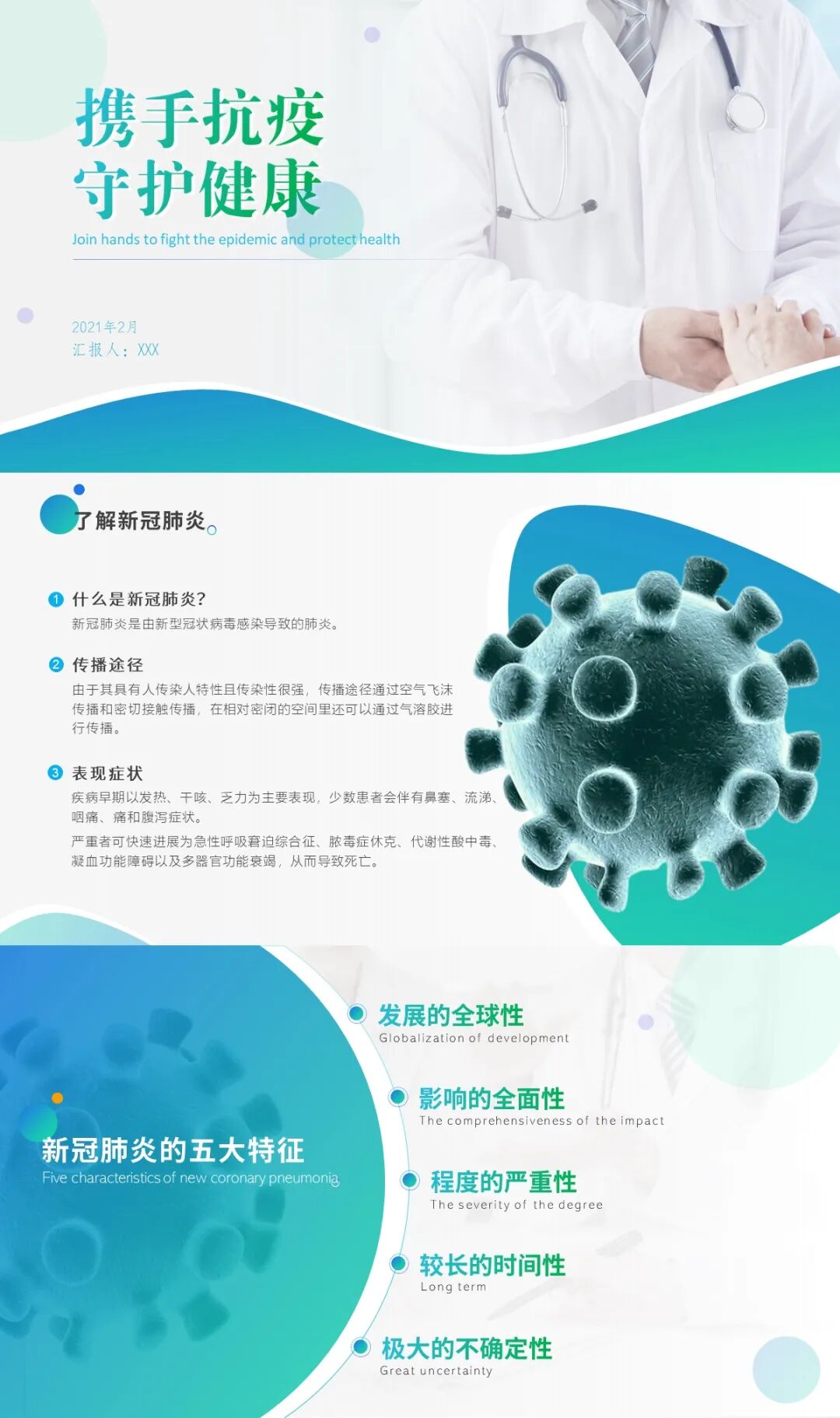 这是没有LOGO色可以参考,那么我们从PPT主题色下手,看到标题 “ 抗疫 ”、“ 健康 ”,你谁想到什么?